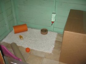 This was my daughters play house which she gave up for her bunny albert! it has lino on the floor and an old bath mat for him to sit on when its cold,i have used a cardboard box filled with hay for a sleeping retreat and then used a plastic dog bed and put hay in it and added a few toys and treats,He has been in a 4ft hutch until we transformed the playhouse and it was wonderful to see him jump and leap when we put him in his new home! he now looks a really happy bunny! He is able to go out into his run and back into the house when ever he wants to which is good as he doesnt really liked being picked up and did get grumpy sometimes when taking him out of his hutch to put him in his run...Also now my daughter has somewhere safe to sit and interact with albert which they both love :)xx